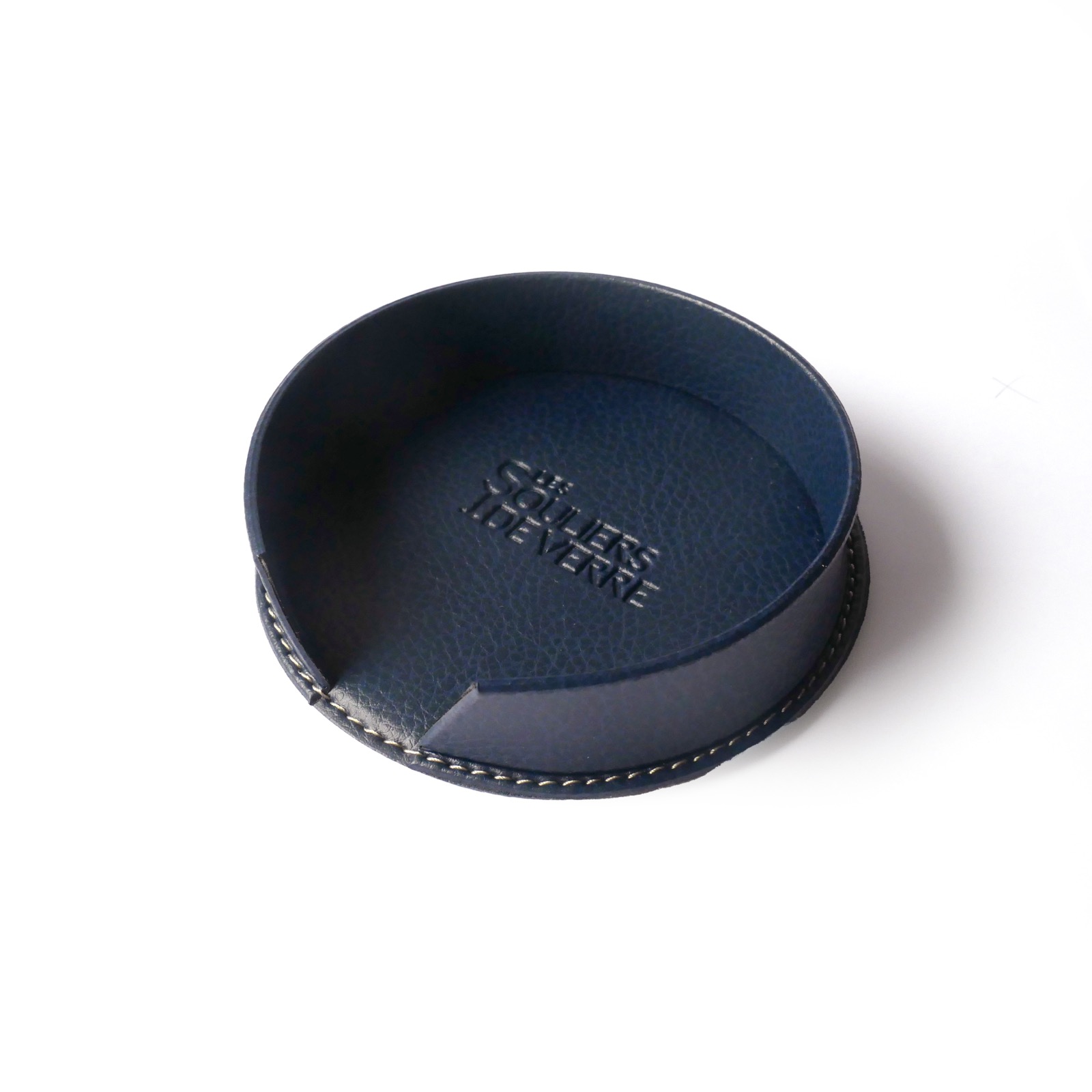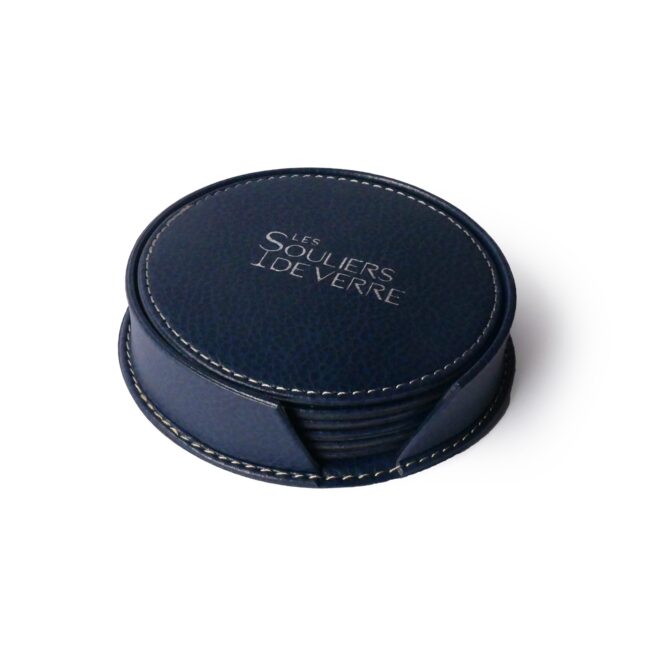 Set de 6 Souliers de Verre bleu, en cuir grainé vegan et couture fil beige. Vendu avec son écrin qui peut également servir de support à la bouteille.
